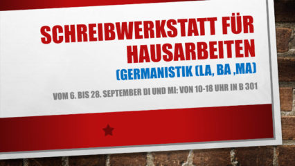 Wir wollen, dass Sie Ihr Studium erfolgreich absolvieren! Vom 6. bis 28. September jeweils dienstags und mittwochs bieten wir ganztägig von 10-18 Uhr Unterstützung bei der Erstellung einer Hausarbeit an. Das Angebot ist Bestandteil des durch die Philosophische Fakultät finanzierten Reintegrationsprogramms und soll helfen, mögliche und eventuell durch CORONA entstandene Lücken zu schließen. Die FSI Germanistik unterstützt das Projekt. Valentin Weber, ein zertifizierter Tutor, steht dafür zur Verfügung. Anmeldung möglich und weitere Infos auf StudOn unter diesem Link https://www.studon.fau.de/cat4669706.html
